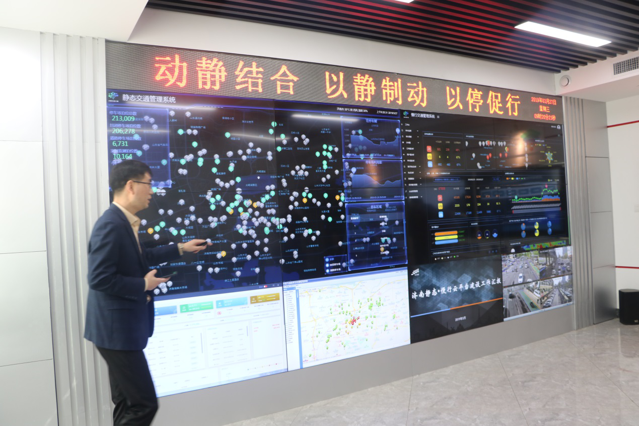 大家首先參觀了七樓數(shù)創(chuàng)中心?!俺鞘薪煌ù竽X”及智慧停車平臺,“一云四中樞”智能交通總體架構(gòu),對接交通運輸、氣象等部門管理數(shù)據(jù),匯入滴滴、高德等互聯(lián)網(wǎng)企業(yè)數(shù)據(jù),構(gòu)建動態(tài)交通感知大數(shù)據(jù)資源池,為聚力打造的泉城智能交通管理新生態(tài)。